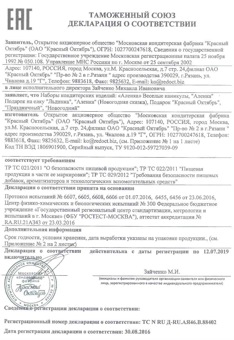 Сертификат соответствия на конфеты "Красный Октябрь" 2019/2020